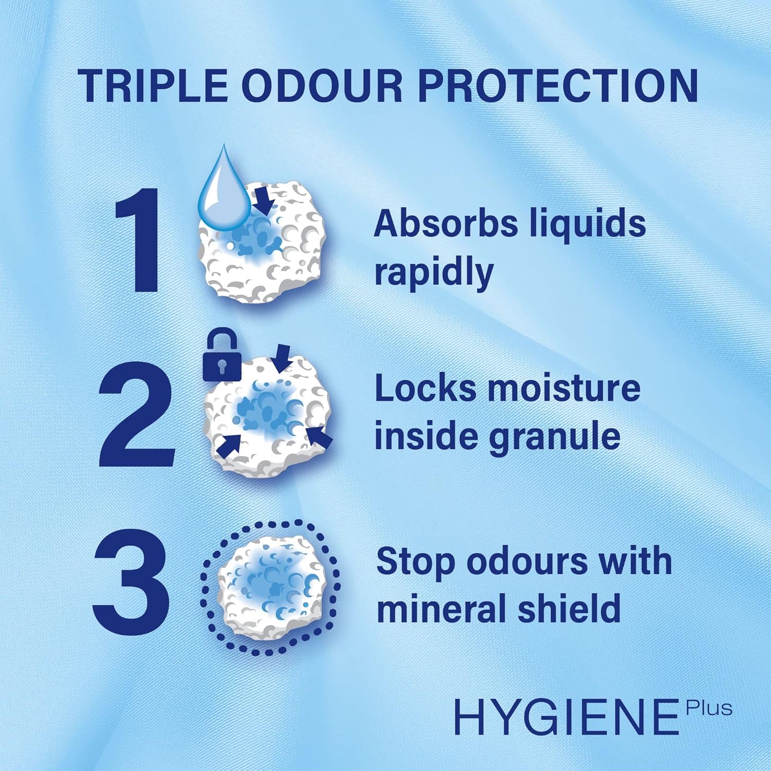 Catsan Hygiene Plus is a high-quality, non-clumping cat litter designed to keep your cat’s toilet fresh, clean and hygienic every day. Made from natural quartz sand and lime, it offers excellent moisture absorption and reliable odour control. The white granules allow you to easily monitor your cat’s health, while the dust-reduced formula is gentle on paws. Suitable for kittens and adult cats. Long-lasting, easy to use and trusted by cat owners worldwide.