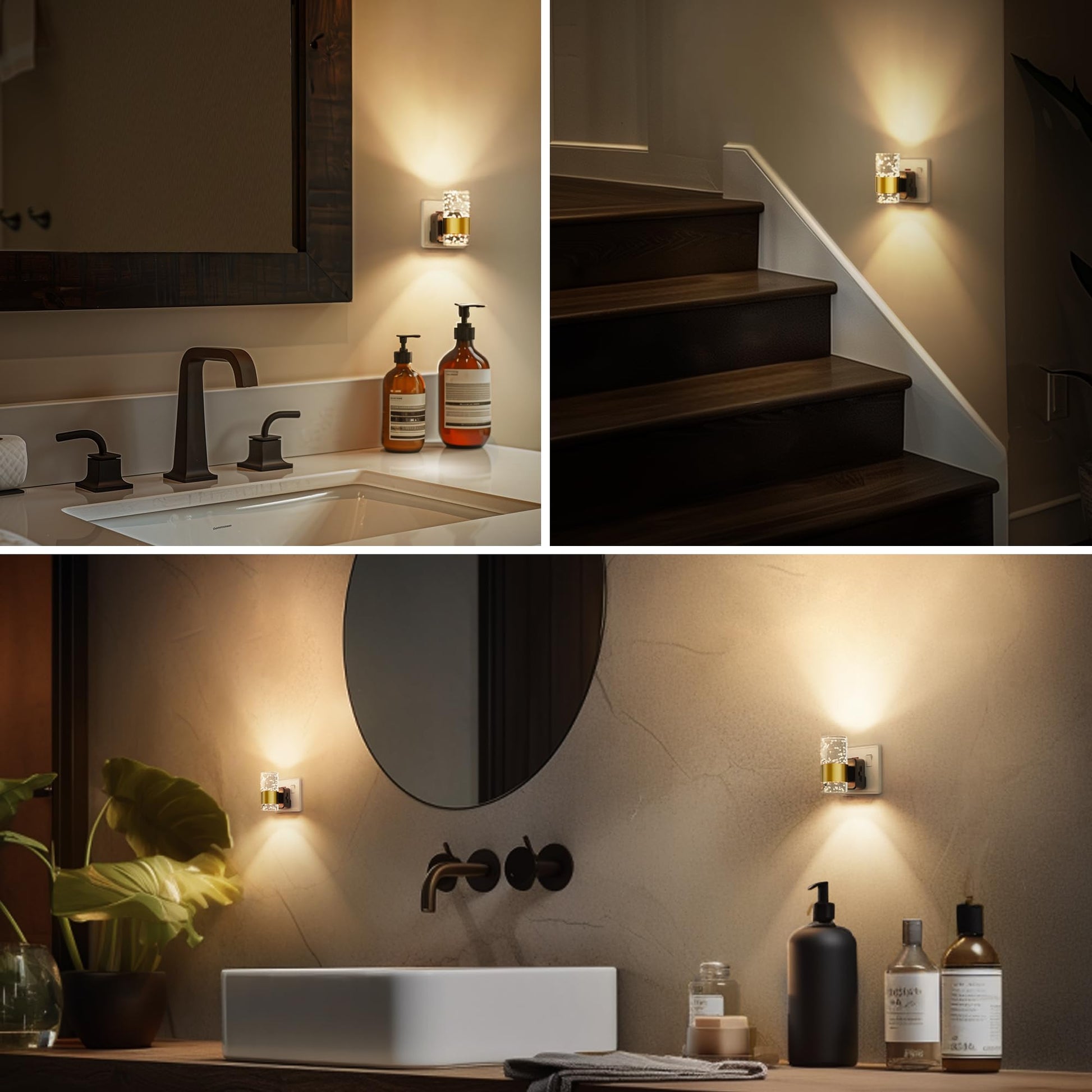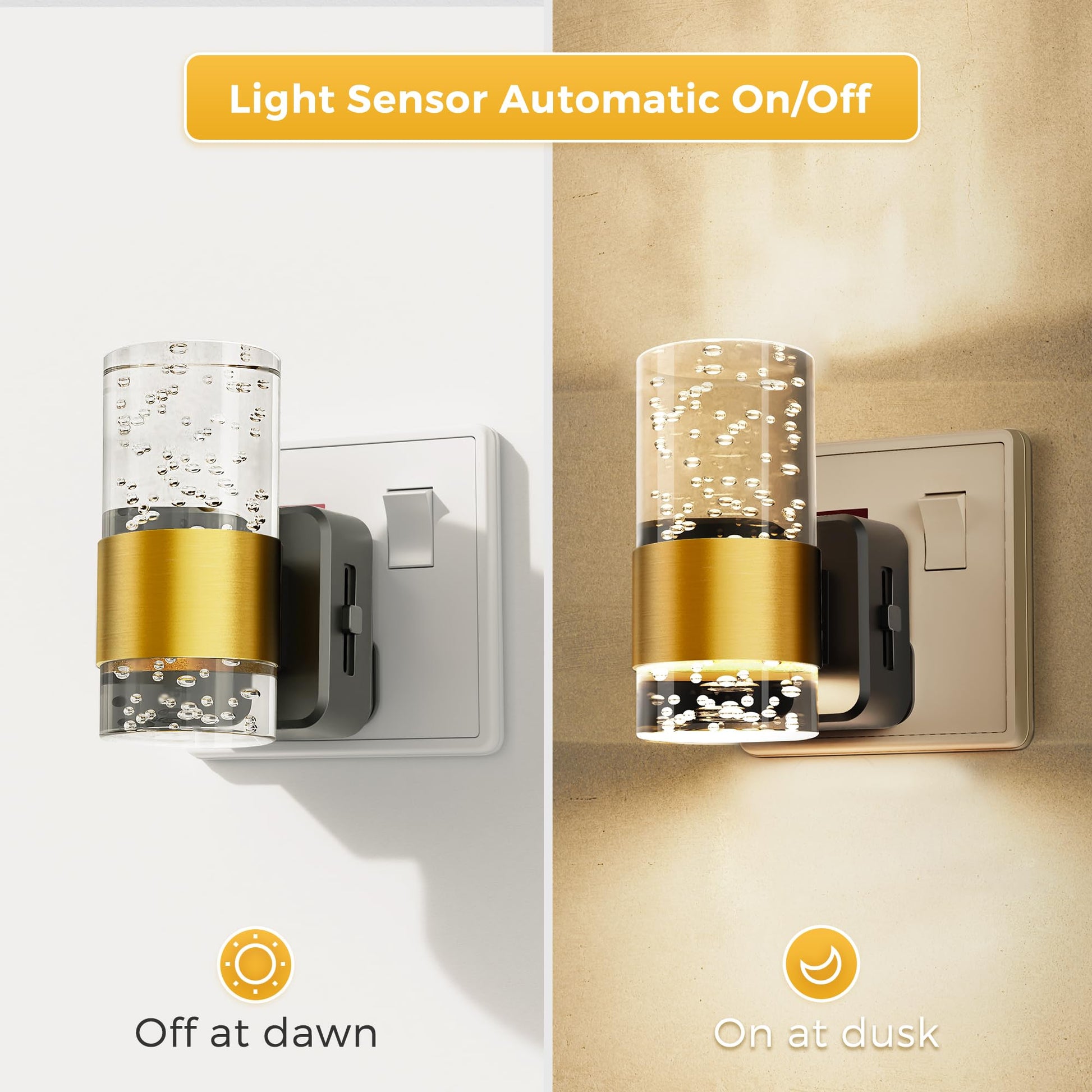 - Unique Acrylic Design: This night light plug in wall features a stunning acrylic cylindrical design, complete with a bubble effect inside and encircled by a beautiful brass ring. It offers a sleek, modern aesthetic that complements any home décor.