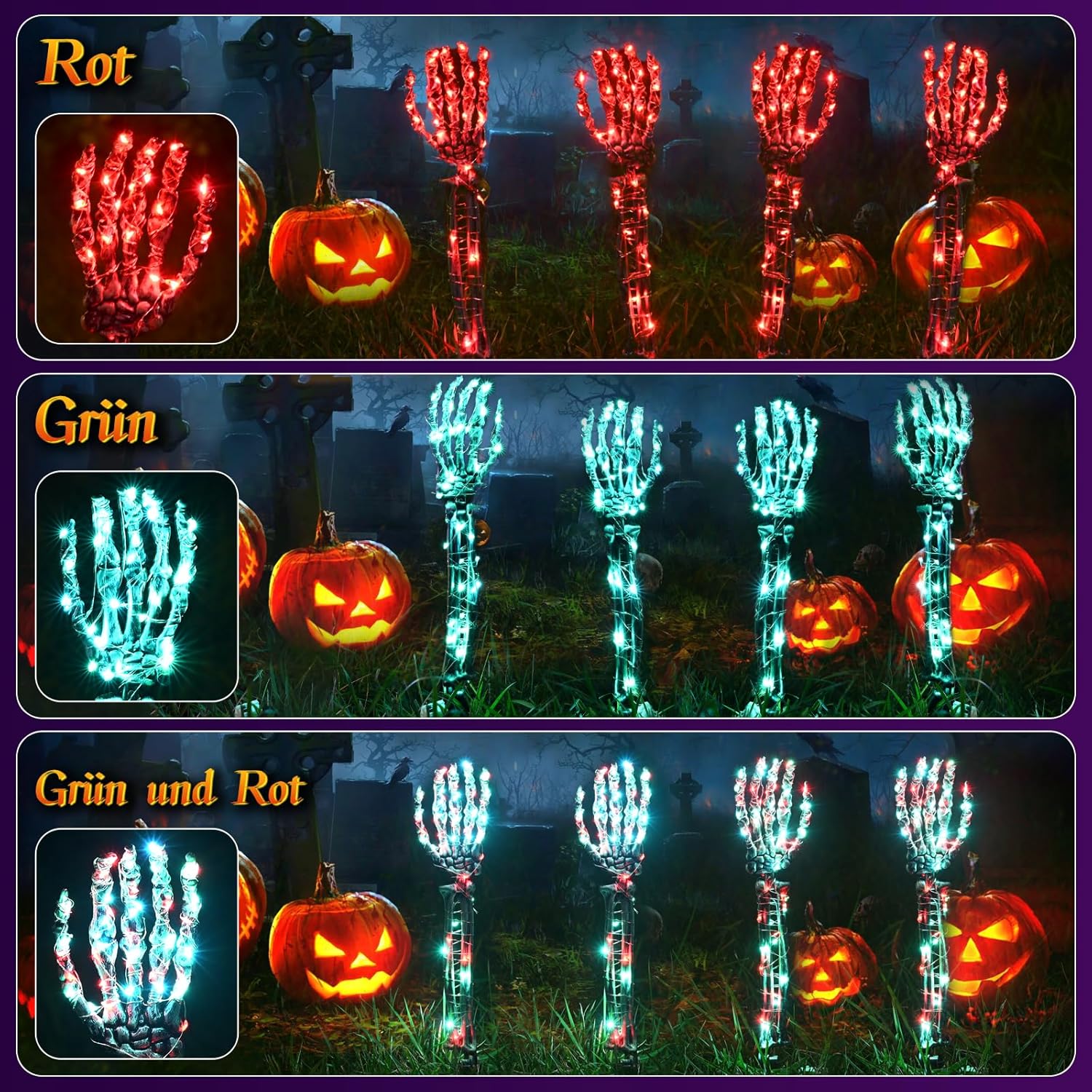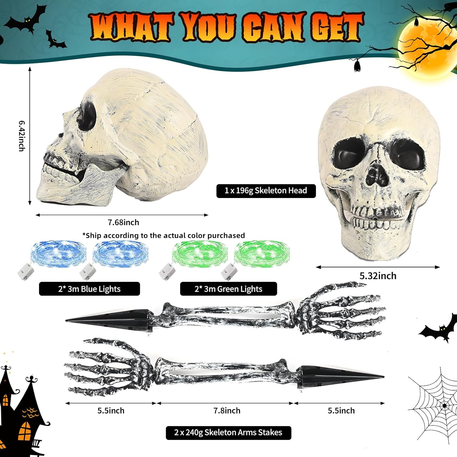 - Lighted Skeleton Set: The Halloween Lighted Skeleton Set includes a 196g skull head, a pair of 240g ground insert hands, 4 *3m LED Lights. Hollow eyes and teeth, with a strip of black and white fine lines, give people a realistic and terrifying feeling. It is enough to scare off your friends and neighbors.