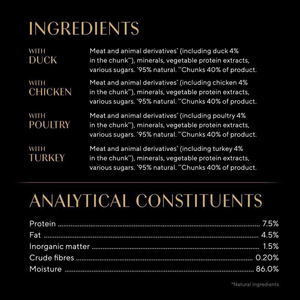 - Multipack with 4 exquisite variety wet cat food pouches in jelly: duck, turkey, poultry and chicken cat food wet pouches in a delicious jelly / Without artificial colours or preservatives