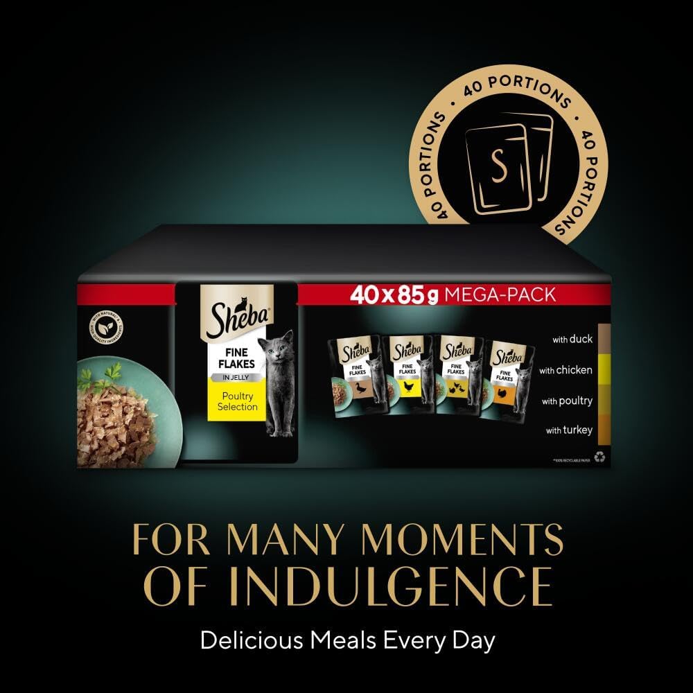 - Items delivered: 40 x 85g bulk food SHEBA Fine Flakes Poultry Collection in Jelly / Multipack with poultry variety / Suitable for any adult cat